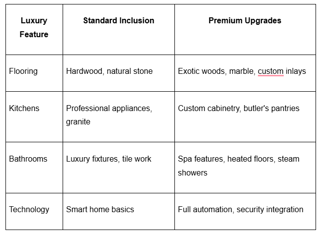Premium Materials: Natural stone, hardwood floors, custom millwork, luxury fixtures distinguishing luxury construction from standard building.